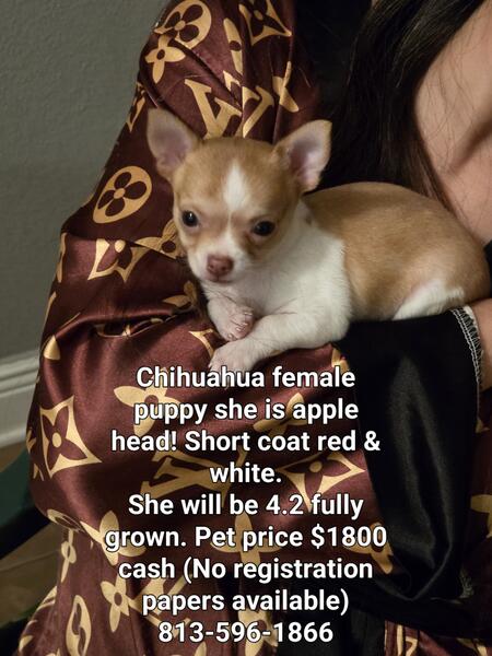 message lnrdl4293 about this ad Chihuahua puppy female apple head she is apple! Short coat color red and white. First vaccine and dewormings up to date! Puppy will stay small 4.5 lbs fully grown. Pet price $1400 cash No registration papers available for puppy. 813-596-1866 |