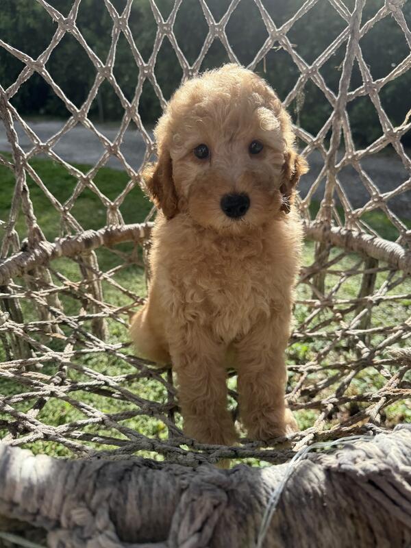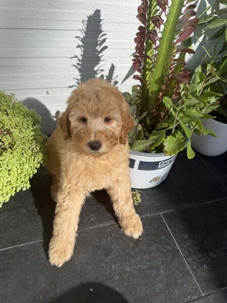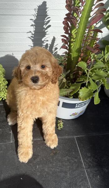 1 female left, born August 11 ready to go to new home. Mom weighs 35lb dad 15lbs. Puppy will probably weigh 20lbs.