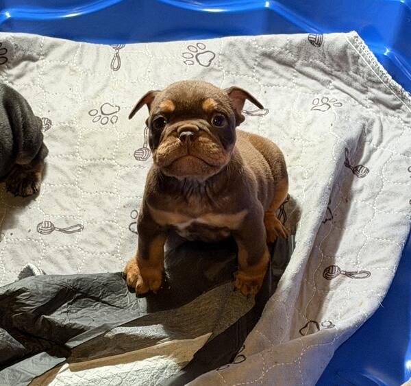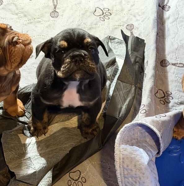 message zbkennels about this ad Hello everyone! We are so excited to share that we have 3 precious, healthy male English Bulldog puppies looking for their forever families 2 Chocolate Tri and 1 Black Tri. Theyre just 8 weeks old now and are ready to bring joy into your home. Raised with Love Our babies are being raised right in the heart of our family home, surrounded by children and other dogs. From day one, theyre being cuddled, socialized, and cared for with love so theyll grow into happy, confident companions. Proud Parents Mom (Black Tri) lives with us and can be seen in person Dad (Chocolate Tri) can be viewed by arrangement Both parents are not only beautiful but also gentle, healthy, and loving family pets What Comes with Your Puppy Each puppy will go home with: AKC papers Age-appropriate vaccinations Deworming Starter food sample And most importantly a heart full of love to give Why English Bulldogs? Bulldogs are known for their unmatched loyalty and gentle spirit. They thrive when theyre close to their families and will happily soak up every bit of love you give them. If youre looking for a devoted, affectionate companion look no further. Pricing $2,500 Pictures of mom and dad are posted above. Well continue sharing photos as these sweet babies grow into their personalities. If youre ready to welcome one of these precious Bulldogs into your heart and home, please reach out they are waiting to be loved by a family just like yours! Can be reached via TEXT 8626219304 message zbkennels about this ad |