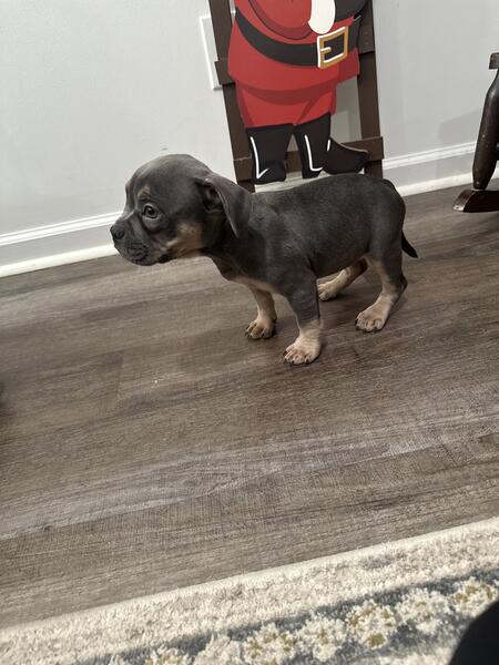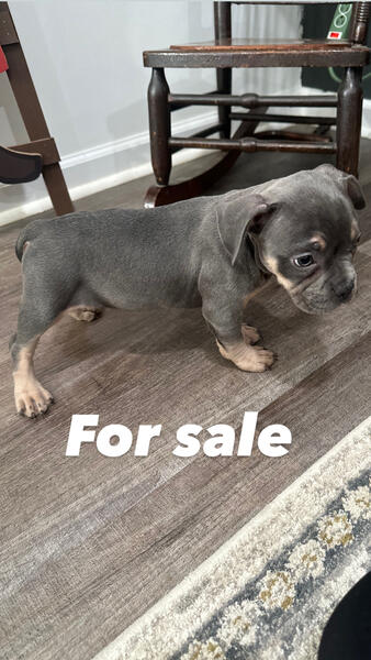 message inkman85 about this ad Her name is tiny we have a tri coat mix between a American bully and a French bull dog shes grey sliver with the tan cream and little hints of white at chest we have parents on sight mother and father great with kids the structure of these dogs should be around the mothers size we believe they will the a little bigger with more of the muscular build from father the 9 weeks old just had there first shots and there dewormed pictures of parents in the photo description this is puppy tiny contact cell 2674443281 name s g |