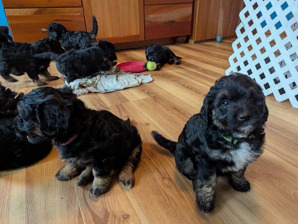 message judyray about this ad F1 mini Goldendoodles. Born May 3, 2025. Two females and three males still available. AKC English Cream Golden Retriever mama. AKC toy Poodle papa. Parents are healthy/DNA cleared. Puppies will be 25-30 pounds as adults. Little to no shedding. Hypoallergenic. Raised and loved in our home. Vet checked, immunized, microchipped, one year health guarantee. If you're interested or have further questions, call or text Judy 440.554.3982 |