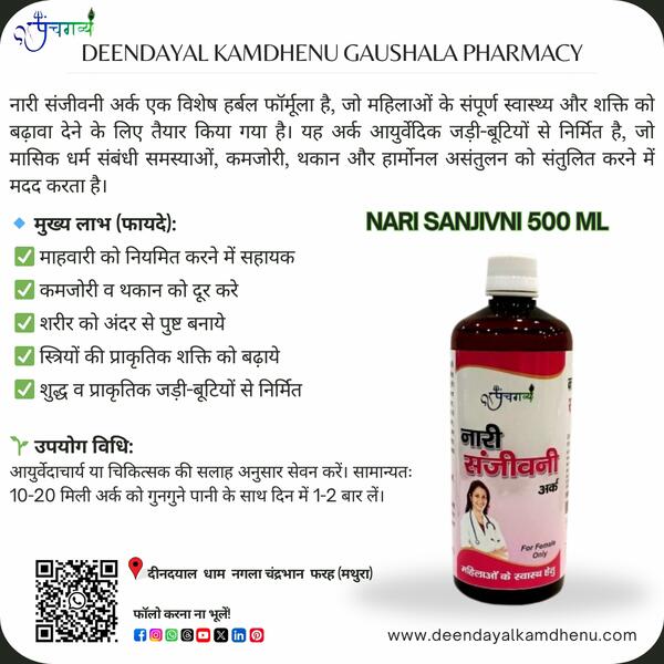 message deendayalkamdhenu about this ad Panchgavya Nari Sanjivni Ark is a special herbal formula prepared to promote the overall health and strength of women. This ark is made from Ayurvedic herbs that help balance menstrual issues, weakness, fatigue, and hormonal imbalance.Shop Now For more info contact |