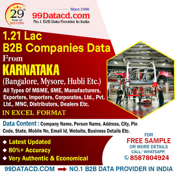 message dataprovider about this ad Buy Indian exporters data from 99Datacd at affordable prices. 99Datacd is a is leading B2B database provider in India. Buy Indian & Importers Exporters Companies (All Trades) DataIn Excel Format. The Indian exporters database covers various Multi-National Companies, Co-Operates Companies, LTD/PVT LTD/LLP Companies, Micro, Small & Medium Business Houses, and Many More. Our exclusive data includes essential information such as Company Name, Person Name, Address, City, Pin Code, State, Mobile Number, E-mail Ids, Website, and Products/Services Details. Discount Offer - Flat 30% Discount On Every Data Purchase. Hurry Up! For a free sample/ more details, call our experts Call/ Whatsapp: 8287639551 Email ID: sales@99datacd.com Address: 206, RG Trade Tower, Netaji Subhash Place, Delhi - 110034, India Website: |