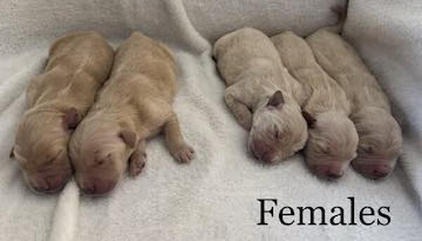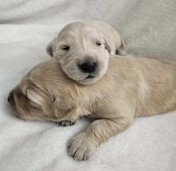message oh4loveofgoldens about this ad Mom is English cream, AKC, genetically tested so pups are clear of diseases & OFA prelim approved for hips & elbows. Dad is dark mahogany golden/red, genetically health tested clear and OFA CHIC certified for hips/elbows, eyes & heart. The puppies are blonde golden and are raised indoors with the family, vet checked, first shots, deworming. One female available, and going home mid August. AKC Limited registration. |