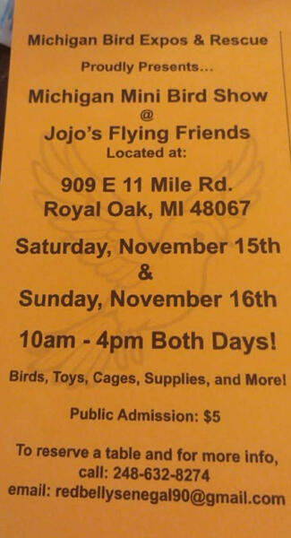 message rdbllys8681 about this ad Mini expo , Saturday and Sunday November 15 and 16 Where you can buy pet birds , toys , food , walk in bird grooming . Raffle prizes. Chopp , birdie bread Help raise money for future expos and money towards rescue birds as well. 5.00 admission support local bird breeders. Location at JoJo flying friends bird store 909 East 11 mile road Royal oak Michigan |