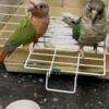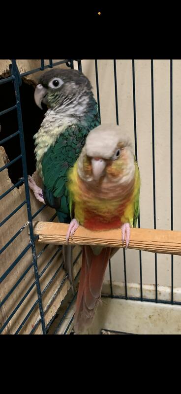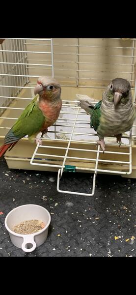 message swahman about this ad Im selling the green cheek conure pair the female is the turquoise and the male is the high red pineapple. the female is 3 years and the male is 4 years old. theyre not tame but will take food from your hand. wings arent clipped pick up only. no cage included please have your own carrier or cage. price is firm or will consider a trade for a green indian ringneck. will not separate! |