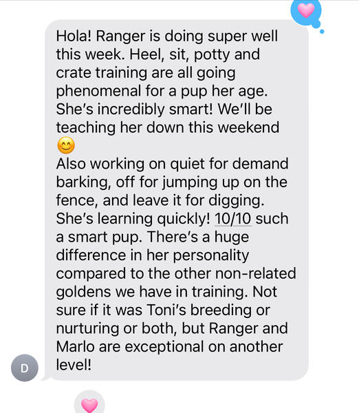 message familylovedgoldens25 about this ad We have 1 cream male born 3/27/25, 1 male dark red & 2 dark female (born 3/22/25) Golden Retrievers available. AKC, health-tested parents. Puppies are vet-checked, up to date on vaccines, routine de-wormer performed, and 2-year health guarantee. Puppies started ENS at 3 days old to 16 days, then we started socialization, exposure to various household noises as well as startling loud noises, introduction to cats and other dogs of different sizes, children from age 2 and up, different hats, skin tones, voices, glasses, everything we could think of. They are therefore well balanced, and confident and so far have adjusted to their new lives well and easily. Puppies live in our living room in a large play area, are familiar with crates and are litter pan trained. They have a play area outside with the opportunity to climb, play in water, tug on toys and chew on toys. Check out our feedback on Google and a few on FB. We have been in business over 12 years. Most of our puppies sell by referral but we had a few people back out due to varies health and family situations leaving an opportunity for you. Please check out our FB and IG Family Loved Golden & English Cream Retrievers for daily pictures and videos. Our website with application is message familylovedgoldens25 about this ad |