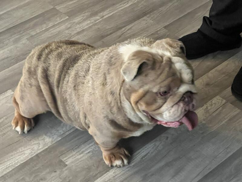 message drapper about this ad I have a beautiful AKC REGISTERED English bulldog for stud service. His name BigBoy. Hes short , short backed, very wrinkled, perfectly square, short legs muscular and stocky with a nice head! BigBoy come from a great pedigree King of the north from the UK Wicked and Wonderboy With Iceman in there that means Mickey Blue eyes is in there a few times too. Along with Bible John and IceMan. King of the North was an amazing producer of puppies with huge rope and short legs. |