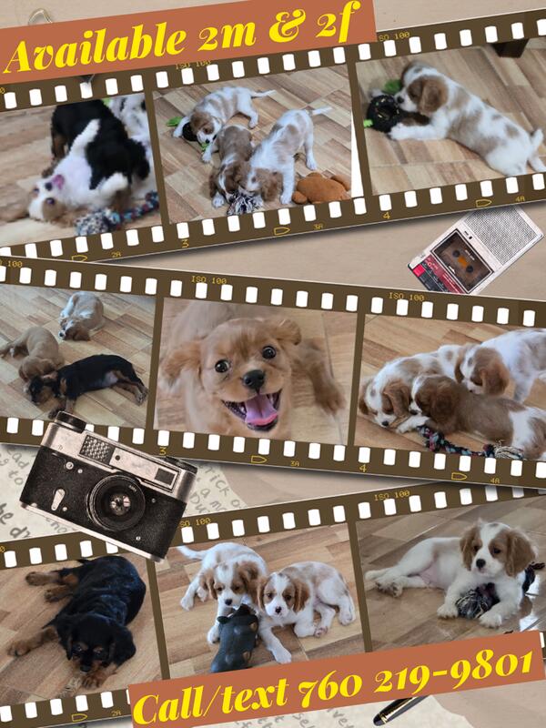 message chris4042 about this ad We have 2 males and 2 female puppies available. A Blenheim male and female, a ruby colored female and a black and tan male. Vaccinated, wormed, healthy happy and well-socialized. Vet-vhecked daily as owner is a veterinarian. They are ready now for their new fur-ever homes. We are located in southern California. $1300 or best offer. Sorry no shipping and scammers don't bother. I know all your tricks. |