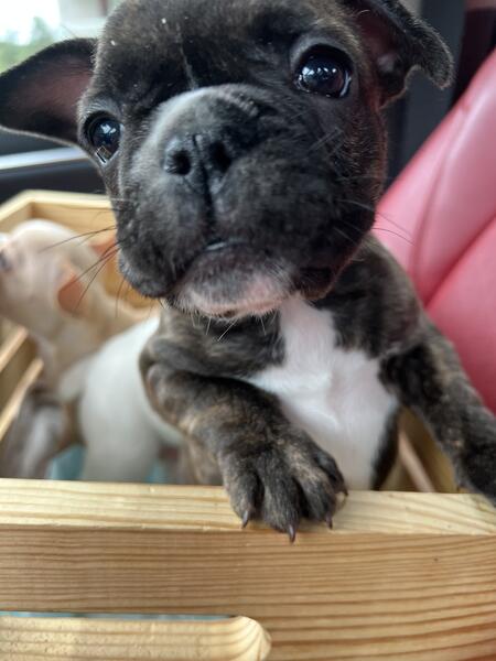 I just recently had a small litter of French bulldog babies. I have one female left here mom is a mini French bulldog at 18 pound and her dad is a standard size. She will not be available till the first week of October but will come with first shots! You can text me at 8o4/ nine21/ two 0 5 three.