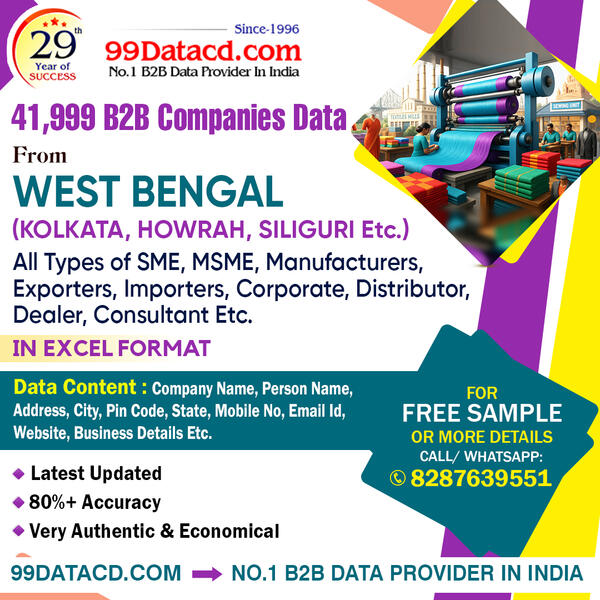 message dataprovider about this ad Are you seeking a verified and updated list of companies in Kolkata? Your search ends here ! 99Datacd, a trusted name for database providers in India. Our expert team offers accurate list of companies in Kolkata at affordable prices. Buy 41,999 WEST BENGAL (KOLKATA, HOWRAH, SILIGURI, Etc B2B Companies Data - In Excel Format. The list of companies in Kolkata covers various sectors such as SME, MSME, Manufacturers, Exporters, Importers, Corporate, Distributor, Dealer, Consultant etc. For more details, visit our website. The data content includes Company Name, Person Name, Address, City, Pin Code, State, Mobile Number, E-mail Ids, Website, and Products/Services Details. Discount OfferFlat 30% Discount On Every Data Purchase. Hurry Up! For a free sample/more details, call our experts Call/ Whatsapp: 8287639551 Email ID: sales@99datacd.com Address: 206, RG Trade Tower, Netaji Subhash Place, Delhi - 110034, India Website: message dataprovider about this ad |