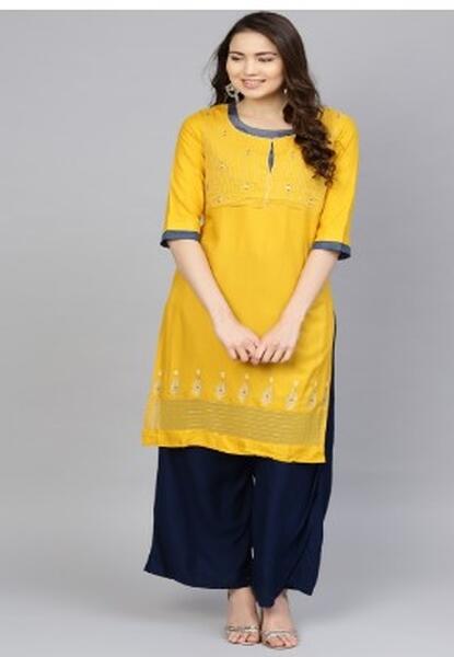 message rohinee about this ad Product Code: 10206819 Mustard yellow yoke design straight kurta with embroidered and layered detail, has a round neck, three-quarter sleeves, straight hem, button closure and side slits The model (height 5'8 is wearing a size S Make a statement with this elegant kurta from W. This mustard yellow piece is a stylish option for a nice family function or event when teamed with churidar leggings and classic flats. Viscose Rayon Hand-wash httpsmyntr.it/Z2gjRuN |