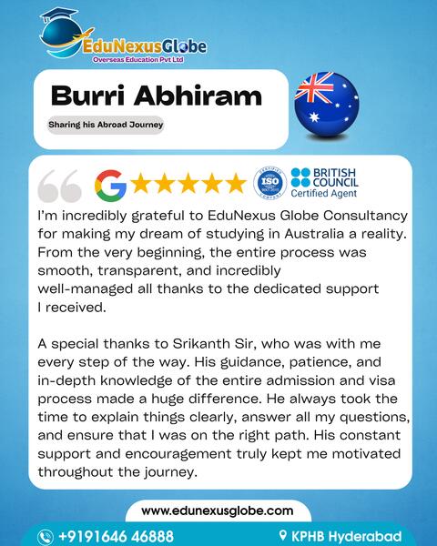 message edunexusglobe about this ad Burri Abhiram shares his inspiring journey of achieving his dream to study in Australia with the expert guidance of EduNexus Globe. From smooth application support to personalized visa assistance, our dedicated team ensured a transparent and stress-free process. With professional mentoring from Srikanth Sir, Abhirams study abroad dream turned into a reality. EduNexus Globe Guiding Students Towards Global Success. Location: Hyderabad, Telangana Phone: +91-9966111337 Website: httpwww.edunexusglobe.com Email: info@edunexusglobe.com forusa reviews forcanada reviews #ukstudyconsultancyinhyderabad |