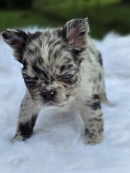 Very handsome Harlequin Merle Fluffy akc registered or pet great personality with the most gorgeous eyes!