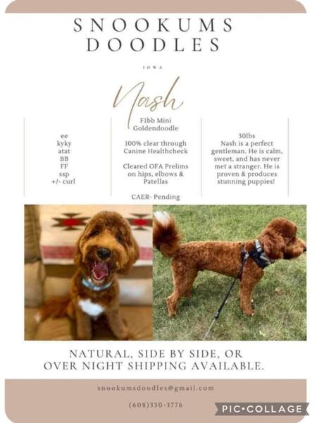 message k6carrie about this ad NOT FOR SALE* Mini Goldendoodle for stud service. Nash is a stunning 30lbs Mini Goldendoodle. This boy is complete gentleman and so sweet and mellow. He is a stunning DARK RED abstract and has the softest fleecy coat. Nash is completely genetically CLEAR. ee Atat kyky BB Ssp Fully furnished curl Located in Dyersville, Iowa. We offer over night shipping and live. |