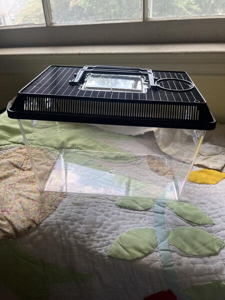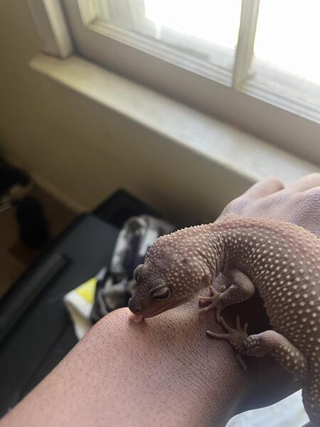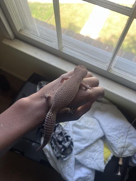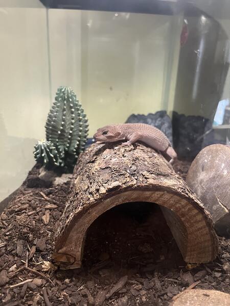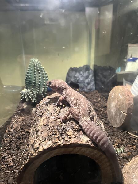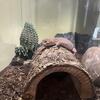 1.5 years old, male, healthy. Tank, substrate, decor, cricket keeper, and feeding dish come with the lizard.