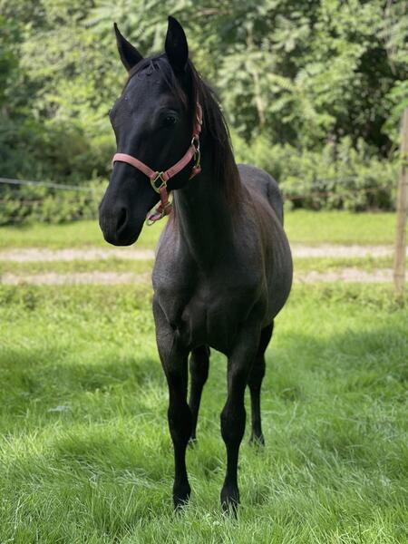 message triplezranch about this ad Ophelia is a coming two year old blue roan mare. Ophelia is an extremely fast learner. She gets turned out and stalled and is great for both. She unloads, loads and will back out of the trailer. She gets turned out with older geldings, mares, other young horses, goats, sheep and ponies. Ophelia will follow you anywhere and everywhere. She w/t/c both ways on a lunge line. Ophelia is also UTD on all vaccinations and wormings and has been on a strict every 3 month farrier schedule since shes been a weanling. |