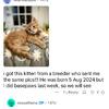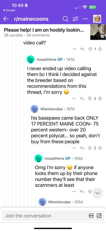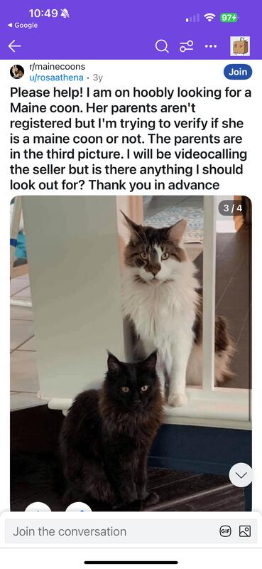 message preciousdreams about this ad I traded a full 100% schnauzer girl for a Maine Coon. as she got older her hair changed and she looked more a domestic cat. When i addressed this and asked if her cat might of gotten outside. she said she did not think so. after getting results back I again sent the results to her. Many blames on other people not taking any responsibly. There were other kittens sold for 1200 as a full Maine Coon. After doing a lot more research she has lied to multiple people. If any one has had dealings with her please message me. |