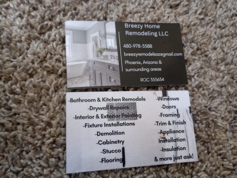 message breezyremodels3 about this ad Breezy home Remodeling LLC. AFFORDALE & PROFESSIONAL FREE ESTIMATES CALL / TEXT (602)980-8445 SOME OF OUR SERVICES: HANDYMAN PLUMBING PAINTING DRYWALL ELECTRICIAN KITCHEN REMODEL BATHROOM REMODEL HOME REPAIR CONSTRUCTION SHEETROCK FENCE REPAIR CONCRETE WORK WINDOWS DOORS AND MUCH MORE CALL / TEXT (602)980-8445 Carpet - Flooring handyman mesa handyman phoenix handy man handyman contractor handy man contractor handyman services Berber Carpet Carpet Install Dark Laminate Flooring Floor Floor Block Flooring Installation Flooring Repair Floors Freize Hardwood Floor Hardwood floors Kitchen Flooring Kitchen Laminate Flooring Laminate Laminate Floors Laminate Tile Flooring New Carpet Saxony Shag Tile Tile floor Tile Flooring Tile Floors Vinly Plank Vinyl Vinyl Flooring Vinyl Floors Vinyl plank Vinyl Siding Vinyl Wood Flooring Wood Tile Remodeling Bathroom remodeling Bathroom Remodel Bathroom Remodelers Basement Remodel Kitchen remodeling Kitchen Remodeler Fencing Aluminum Sun Rooms Cedar Fencing Picket fences Fence repair Fence contractors Stained wood Fence Fixing Fences Fencing repair Fence installation Pergolos Professional Painters Deck Decks Fencing Contractor Gazebos Barbed Wire Backyard Chain Link Steel Privacy Fence Professional Painter Patio Quotes Pvc Outdoor fences Barn Fence Solid Wood Deck Repair Decks Wood Fence Concrete Patios Concrete Steps Countertops Retaining Walls Concrete Pavers Plush Driveway Flatwork Polishing Concrete Sawing Or Removal Flatwork Repair Paver Foundation Cutting Services Stamped Polishing Patios Walks & Steps Pool Decking Stamp Staining Resurfacing Slab Foundation Decorative Concrete Quality Pouring Concrete Work Lawn Sod Installation Landscape Design, Lighting & Repair Land scape message breezyremodels3 about this ad |