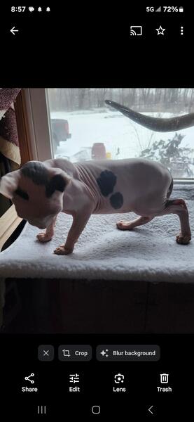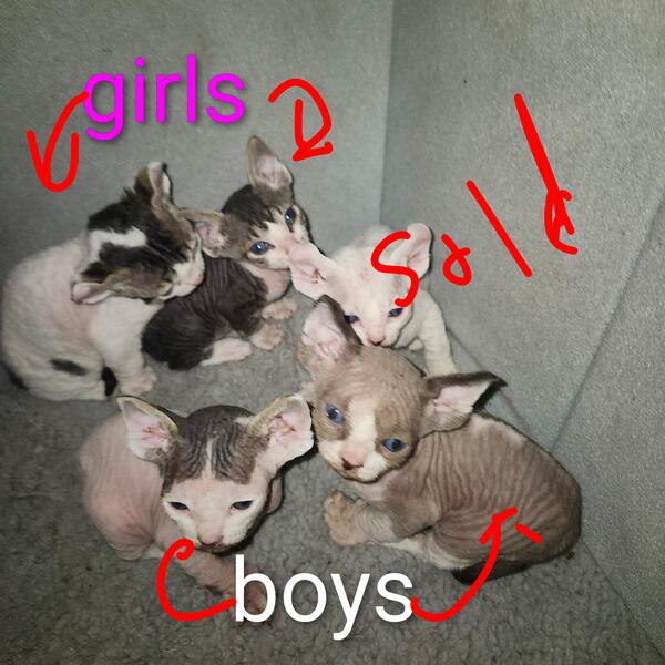 message squeakandbeau about this ad Dad is elf ear sphynx peach fuzz hair white with blue markings on skin. Mom is devon rex gray and white wavy hair. Both are cuddle bugs Happy and healthy. Babies are here 8/12/25 one peach fuzz. Are ready with vet check October 12, 2025. 1200. |