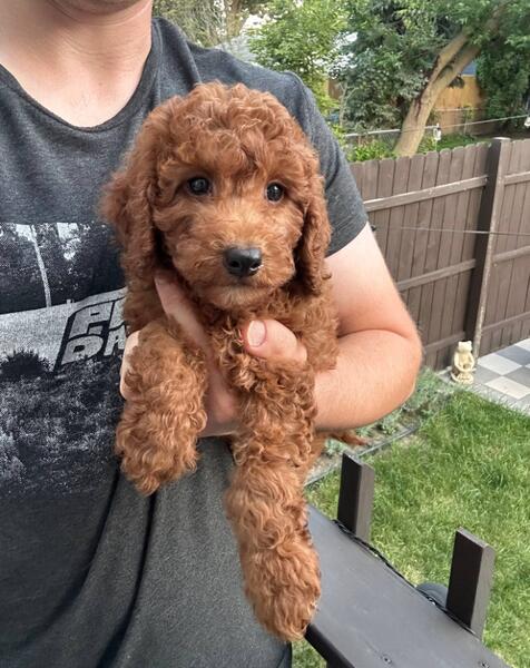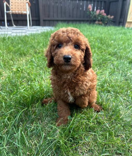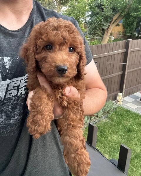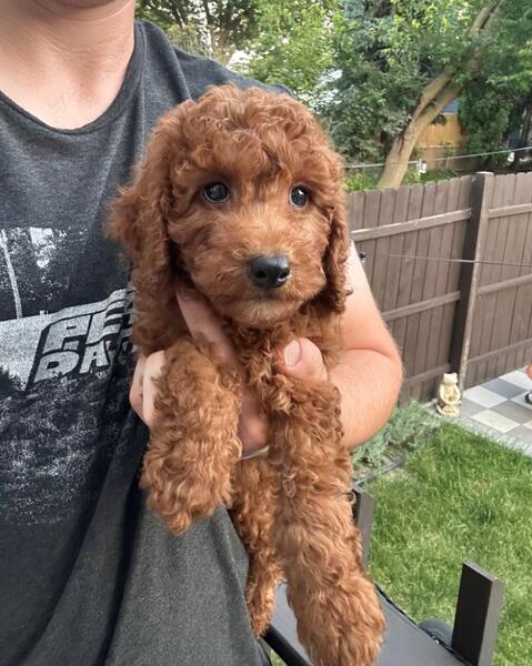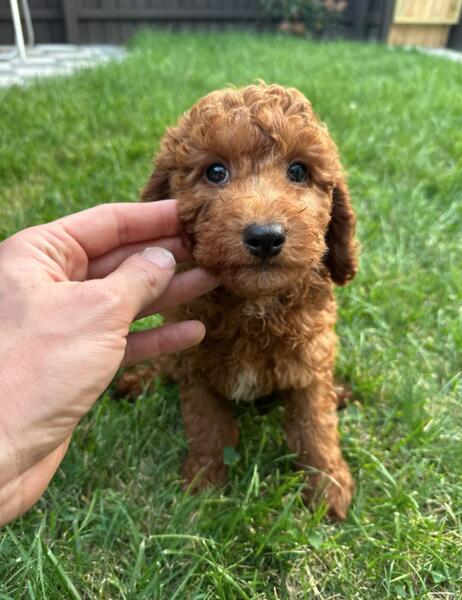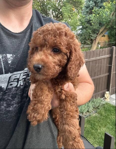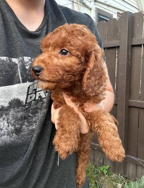 message antonfzv about this ad Meet Ivy. This little girl is absolutely gorgeous, beautiful rich red color coat with a white spot on her chest. She has the most beautiful eyes. She's very friendly and loves to cuddle. She's well socialized and will be great with kids and other dogs. She would make a great addition to any family. She's 3/4 mini poodle, 1/4 golden retriever, making her an f1b mini. This type of goldendoodles is considered hypoallergenic and low to no shedding Full grown she should be 20-25 lbs. She already started on potty training and ready to leave to her furever home anytime now. She's all up to date on shots, dewormed and will come with a 1 year congenital health guarantee. For more information or to schedule a visit please call or text 414-317-1412. We're located in Milwaukee WI, midwest hand delivery or nationwide shipping possible for an extra fee |