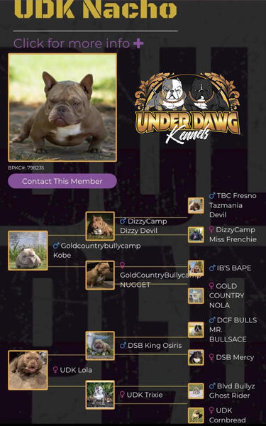 message hmoon about this ad UDK Nacho 4 years old 43 lbs 10 inch micro bully Proven producer of micro & nano bulls and tri color. Dont let the ears fool you, this boy is all bully. Full tail. |