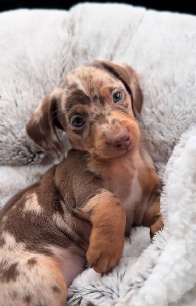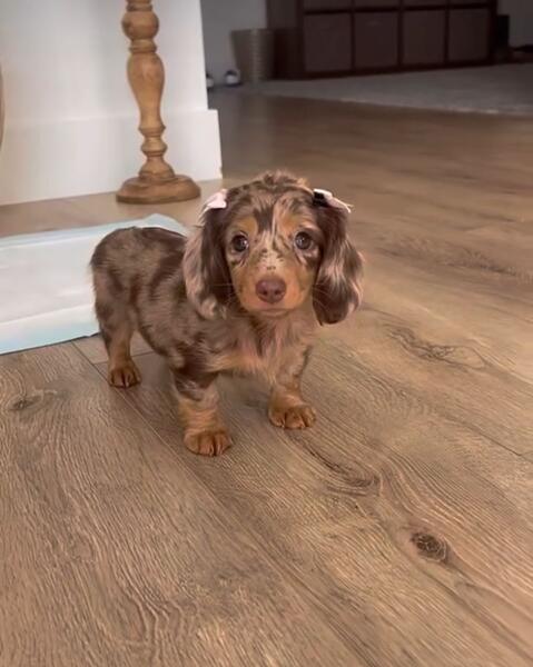 message stacymarie76 about this ad Our family has three beautiful small mini dachshund puppies left looking for loving homes. We have a smooth coated chocolate female. Long coated chocolate dapple female and a Smooth coated chocolate dapple male left. They use puppy pads and they go outside too. They also come updated on their first sets of shots. They are very affectionate and very well socialized we handled them since birth. We ask that they go to very loving homes call or text me Stacy at 574-318-7532 |