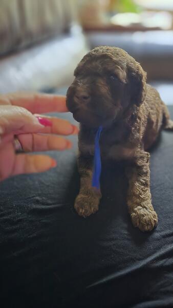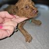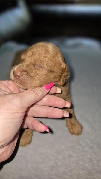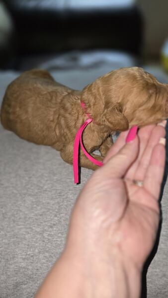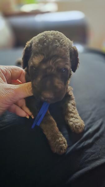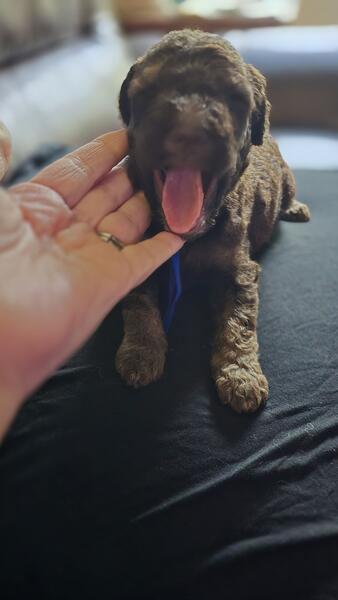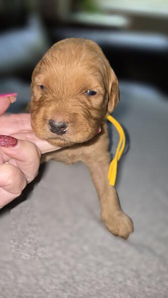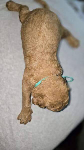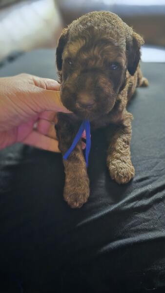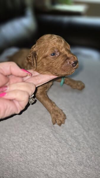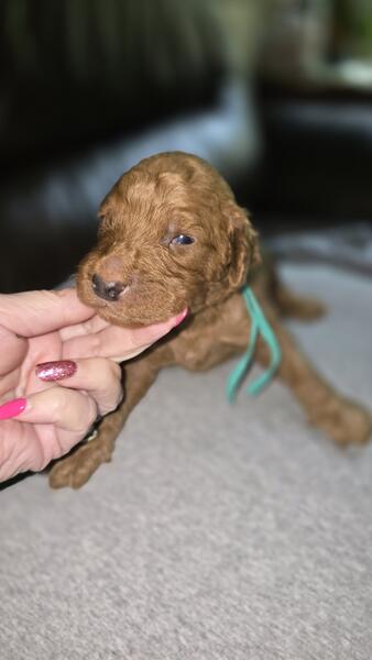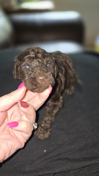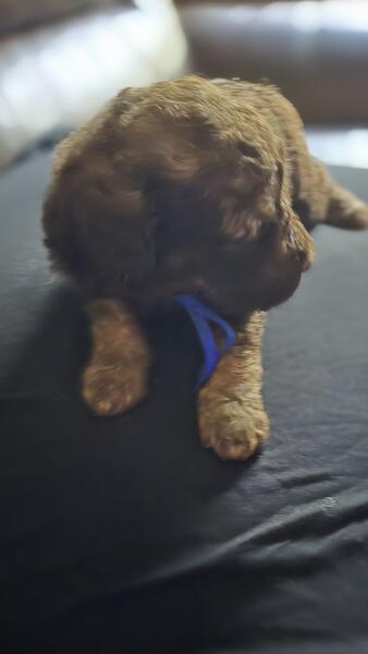 2 different litters reds are f1b more wavy, chocolate phantoms are f1bb curly with green eyes