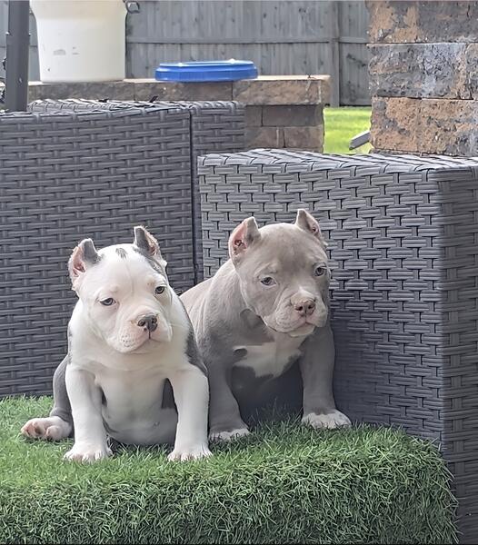 message apollo about this ad I have two, 11 week old female puppies available. One Blue and white, one Lilac. Ears cropped, shots up to date. 1800 each. If interested, please text me, 2014634696. Parents pictured. |