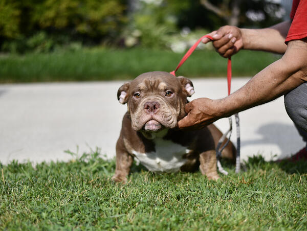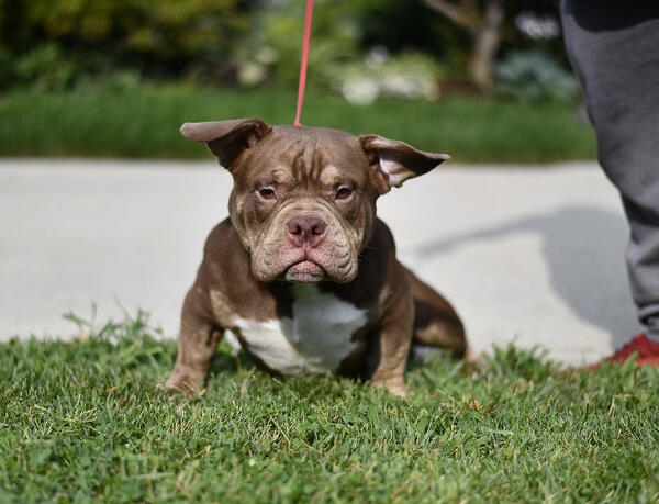 Beautiful male, chocolate tri color, full tail, miagi blood, super thick and compact