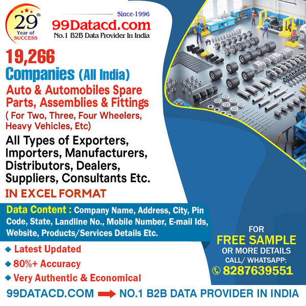 message dataprovider about this ad Looking for automotive companies list? Look no further! 99Datacd is a leading data provider company in India. Our automotive companies list helps you connect with the right vendors. The list of 19,266 Companies engaged in auto & automobile parts, assemblies & Fittings ( for two, three, four wheelers, Heavy Vehicles, etc .Our company's profile consists of manufacturers, Exporters, Dealers, Suppliers, Importers, Distributors, wholesalers, agents, & Traders, etc. The data includes company name, address, city, pin code, state, landline No mobile number, e-mail Ids, website, products/services details. Pay and download the exclusive data in excel format. Don't Miss Our Super Discount Offer - Flat 30% Discount! For a free sample/ more details, call our experts Call/ Whatsapp: 8587804924, 8287639551 Email Id: sales@99datacd.com Address: 206, RG Trade Tower, Netaji Subhash Place, Delhi - 110034, India Website: message dataprovider about this ad |