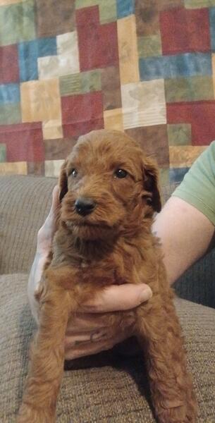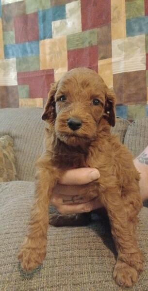 message angelnumber71980 about this ad Stunning female irishdoodle. Will come with shots done to date. As well as a 1 yr genetic health warranty! Can also be registered! Comes from non fading lines puppy will stay very dark red thanks for looking. |