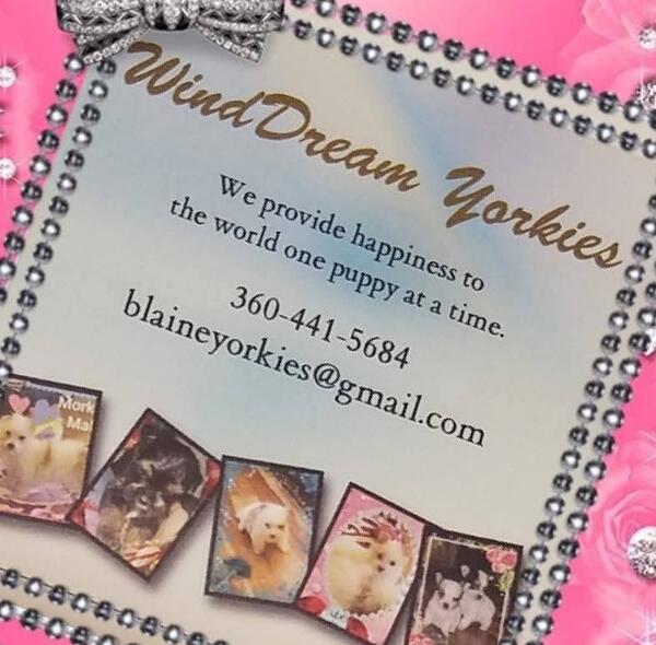 message winddreamyorkies about this ad WindDream Yorkies Real People, Real Puppies Wed love to hear from you! If youre truly interested, please give us a call at 360-441-5684. Phone calls onlyno texts, please. You can also find more details on our Facebook page: WindDream Yorkies. Kind reminder: We do not sell our puppies for breeding. All of our contracts include a spay/neuter clause, which we take very seriously to ensure the well-being of our puppies. We look forward to chatting with you soon! Priced $5001500 |