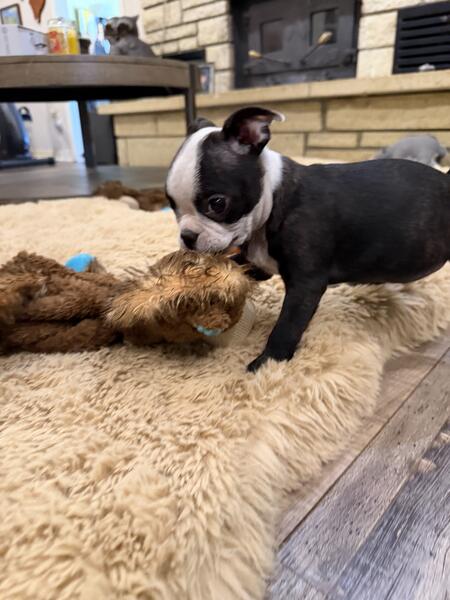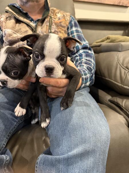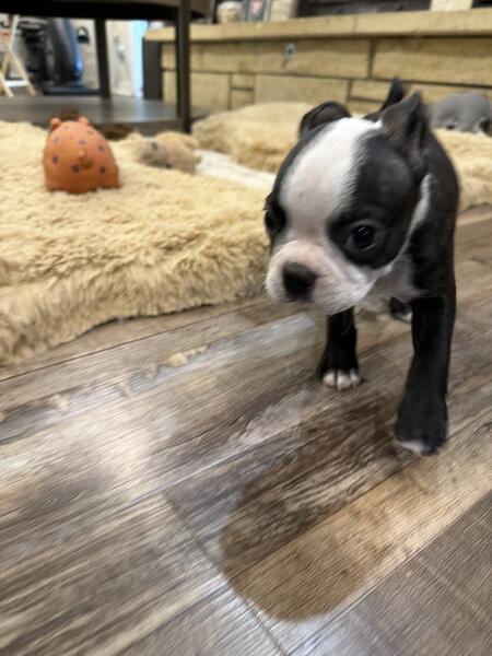 message pogle about this ad Handsome AKC Boston Terrier puppies. This ones name is Jack! They are all very cuddly, cute and friendly. They were born 8/28/25. They will be ready to go to their new home by 10/31. They will come with registration papers, up to date vaccination records, vet check and limited guarantee. To reserve a puppy, we require a $200 non-refundable deposit to hold. Delivery can be via pick-up or shipped. We usually can ship for around $300, we just need your zip code. |
