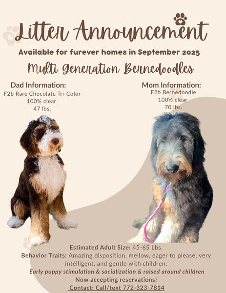 message gasbarro17 about this ad Estimated Adult Size: 45-65 Lbs. Behavior Traits: Amazing disposition, mellow, eager to please, very intelligent, and gentle with children. Early puppy stimulation & socialization & raised around children. Born July 19, 2025 4 girls and 4 boys Contact: Call/text 772-323-7814 |