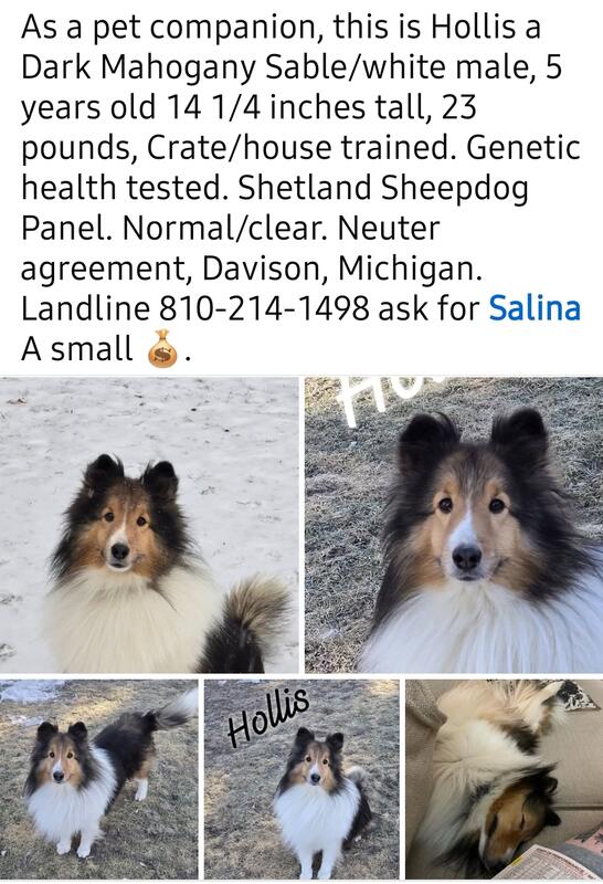 message serenadeshelties about this ad Davison, Michigan SERENADE SHETLAND SHEEPDOGS > FACEBOOK Live with a teenager human and 2 Ragdoll kitties. ALL RAISED INSIDE A LOVING HOME. Holistic integrated wellness health care. ALL crate/house trained. Scarlett 4 years old Octavia 4 years old Hollis 5 years old As a companion pet, update on puppy vaccinated by a licensed veterinary. We will provide you with a detailed vaccination recommendation to share with your veterinarian. We follow Dr. Jean Dodds Vaccination Protocol to avoid any health issues caused by over-vaccinating, a common issue with Shetland Sheepdogs and other Herding breeds. We highly recommend TITER TEST before anymore vaccines be given, so the vets not over loading the immune system. AKC Shetland Sheepdog OUR CARE PACKAGE Before a Serenade pup goes to their new homes, each one of our puppies will receive. Our puppy packages include: * Trim nails every 2 weeks started at 2 weeks of age. * Starting on ear bracing * Early Potty and crate Training * Basic commands * At 3 to 5 days old back dewclaws removed from a licensed Veterinary. If puppies have back dewclaws we will have all dewclaws removed. * 2 Veterinary well pup Check/exam * Current on Vaccinations ( We will provide you with a detailed vaccination recommendation to share with your veterinarian. ) We follow Dr. Jean Dodds Vaccination Protocol to avoid any health issues caused by over-vaccinating. TITER TEST FIRST. * De-wormed with Pyrantel at 2,4,6,weeks and Panacur C 8 and 12 weeks * Health record * Pet Companion ONLY. Is a Sheltie the Right Dog for You? The Shetland Sheepdog (Sheltie like any other dog breed, does not fit every household. Shelties have many temperament traits, and certain of these are fairly universal to the breed. Shelties were bred and used in the harsh environment of the Scottish Shetland Islands to help shepherds with their sheep. Many of their traits made them perfect for this work. Its important to remember their roots when you think about their temperament. * Shelties do bark. They will let you know when something is not right, when theyre happy, when they play, and especially when they have something to say. However, some Shelties do not bark very much. * Shelties are reserved. Some people call this shy, but most Shelties prefer to get to know someone before getting close to them. * Shelties are extremely loyal to the people they know best. * Shelties are sound sensitive and sound reactive. They are always on duty. * Shelties may chase (herd) almost anything that moves. * Shelties are very smart and need to have their minds and bodies occupied. Many will invent a "job" if they are not given one. And, you may not like this "job * Shelties do not like to spend time away from their people. Left alone all day, a Sheltie is usually not very happy. * Shelties are very sensitive to the moods of their people. They need a home where gentleness is the way of life. * Shelties are an active breed and need exercise every day - more than a 10-minute walk around the block. *Shelties have a double coat (rough outer coat and soft undercoat and they need regular (minimum every two weeks) thorough grooming. Tumbleweeds are common in Sheltie homes. *Shelties want to be an integral part of their family. They pay attention to everyones business and may make comments on their observations. They dislike being left behind and will show their disapproval, often by barking, twirling, and jumping. *Shelties are selective as to who is worthy of their affection and who is to be observed from a distance. They sense human moods and will be happy and sad along with you. They love attention, and they love to learn - Shelties are very easy to train. They excel at dog sports like agility, obedience competition, rally, disc dog, flyball, and herding. In summary, if you are considering bringing a Sheltie into your home, be prepared to spend a lot of time, energy, and love on this new family member for that is what they need to thrive. In return they will give you some of the most wonderful moments of your life and memories you will cherish forever. Learn lots more about Shelties on the website of the American Shetland Sheepdog Association and in Sheltie Talk, by Betty Jo McKinney (new edition 2010 message serenadeshelties about this ad |