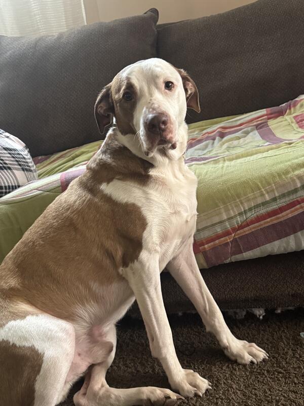 Brown white Australia Shepard mix with Coby pit very energetic dog love kids very friendly he is 2 years old