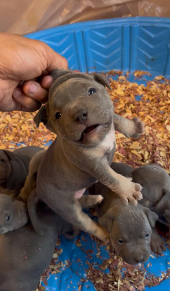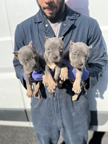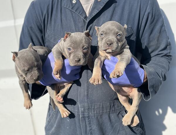 Blue tri pocket bully pups born 10/03/25. Utd on shots and dewormed. ABKC Registration in hand