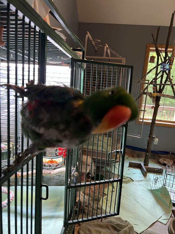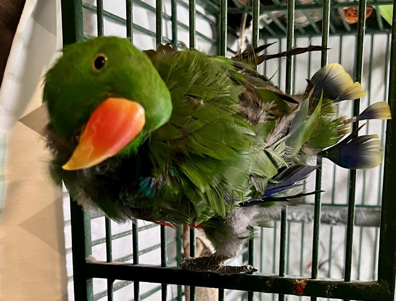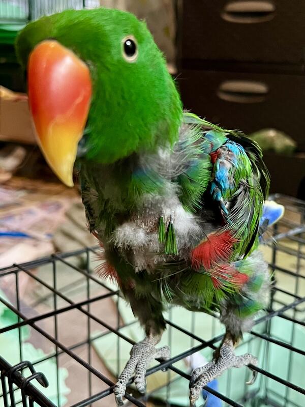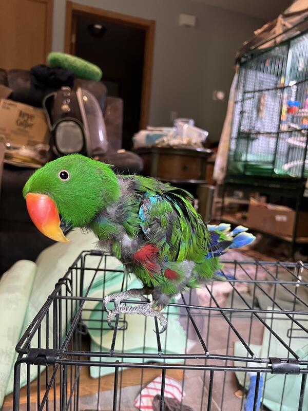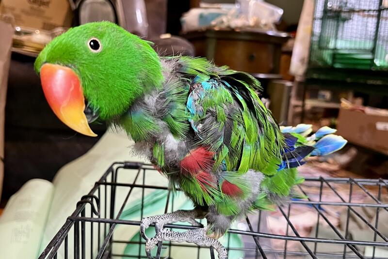20 yr old male Eclectus. He talks and can be very sweet. Prefers men. Does pluck but not to the point of injury.