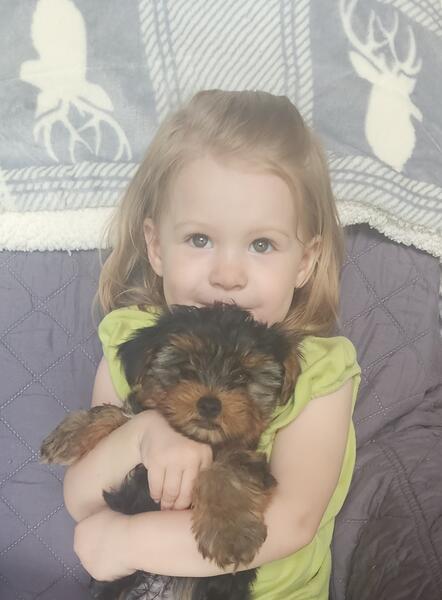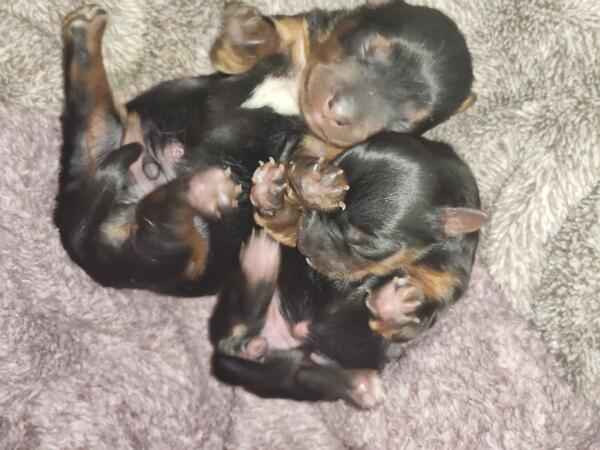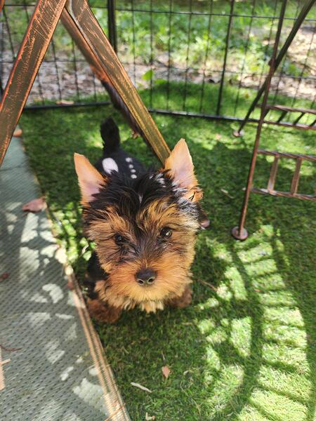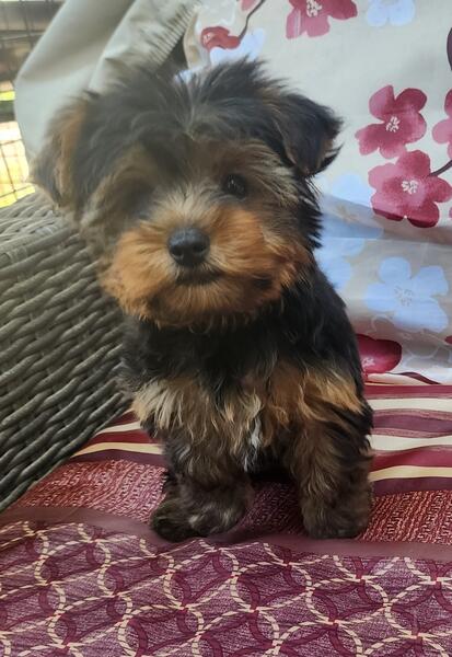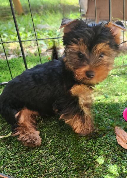 message bonnitanorman about this ad Bonita Besties Yorkies 2 male, 1 female born 4/12/24. Parents AKC Dam and Sire. Tail cropping, dew claw removal, first three vet visits, vaccine series, and worming completed. Socialized among children, two doberman, two shorkies, and a large cat within the home. Well exposed to riding in vehicle as breeder is a traveling nurse and takes them on assignment in RV 4 days a week. Accustom to kenneling when breeder goes to work, regular grooming and managing stairs. They love going outdoors in the fenced in yard at campgrounds. Dam is 5lbs and Sire is 6lb. Can provide parent pics upon request. male 1 projecting 5-7 lbs male 2 projecting 5-6 lbs female projecting 4-5 lbs. |