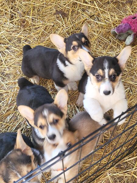 message lilrapson70 about this ad 6 Pembroke Corgis. 5 Boys & 1 Girl. Tails docked & dew claws removed during vet check at birth. Born Aug 3rd, ready for their forever homes. 2 sets of puppy shots given and dewormed. Please excuse my pic taking abilities. The parents are my fur babies. Feel free to message with questions. |