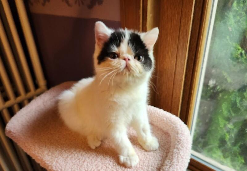 Black and white exotic male kitten for sale. Super sweet and friendly. 12 weeks old (5/9/25)