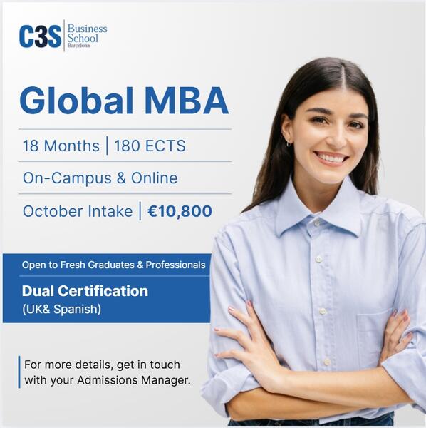 message samc3s about this ad Barcelona, the cosmopolitan capital of Catalonia, isnt just famous for its stunning architecture, Mediterranean beaches, and vibrant cultureits also one of Europes fastest-growing hubs for global education. In recent years, the city has gained international recognition as a top destination for MBA aspirants, especially those looking for a Global MBA in Barcelona. Why Choose a Global MBA in Barcelona? The decision to pursue an MBA is a major step toward building a strong foundation for leadership in todays competitive global economy. What makes Barcelona stand out for a Global MBA? Strategic Location in Europe: Barcelona provides the perfect gateway to both Western and Eastern markets. With world-class infrastructure and excellent connectivity, it is a preferred base for multinational corporations and startups alike. Thriving Business Ecosystem: The city is home to several international companies, tech parks, and innovation centers. As a student, youre not just studying businessyoure living in the middle of it. Cultural and Professional Diversity: With students and professionals from all over the world, Barcelona offers a unique multicultural environment that prepares students for real-world global business dynamics. English-Taught Programs with International Exposure: Most Global MBA programs in Barcelona are taught entirely in English and emphasize global case studies, industry visits, internships, and international networking. C3S Business School: A Rising Leader in Global MBA Education When exploring options for a Global MBA in Barcelona, one name that consistently appears on the radar of ambitious learners is C3S Business School. Located in the heart of Barcelona, C3S Business School (Castelldefels School of Social Sciences) is known for its modern approach to business education, focusing on innovation, entrepreneurship, and global leadership. message samc3s about this ad |