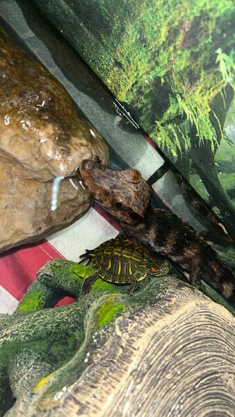 Unsure of his age hes not to big hes in a 75 gallon I think tank which comes with also 2 red eared slider turtles