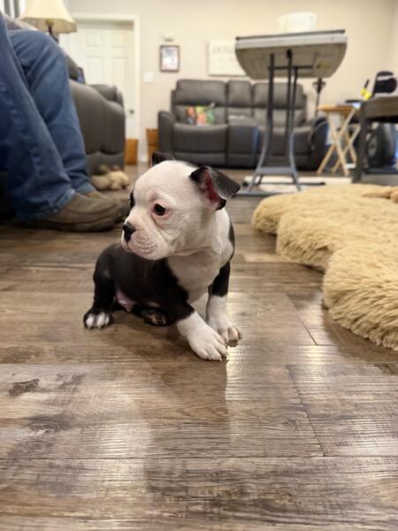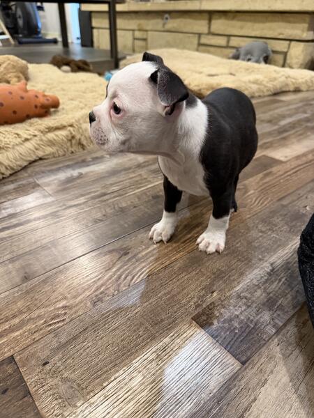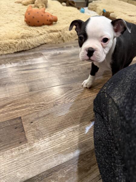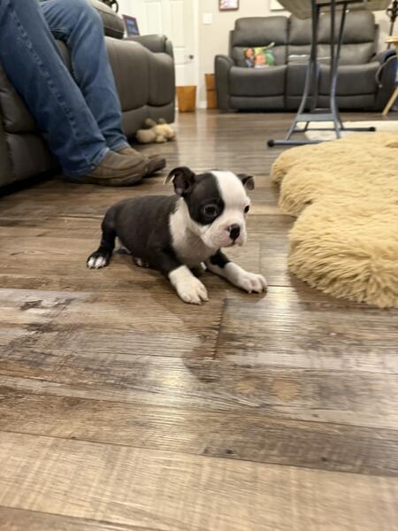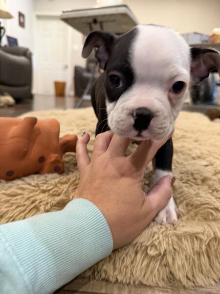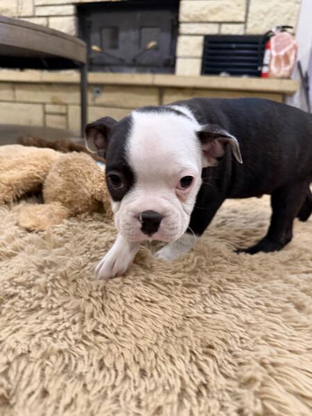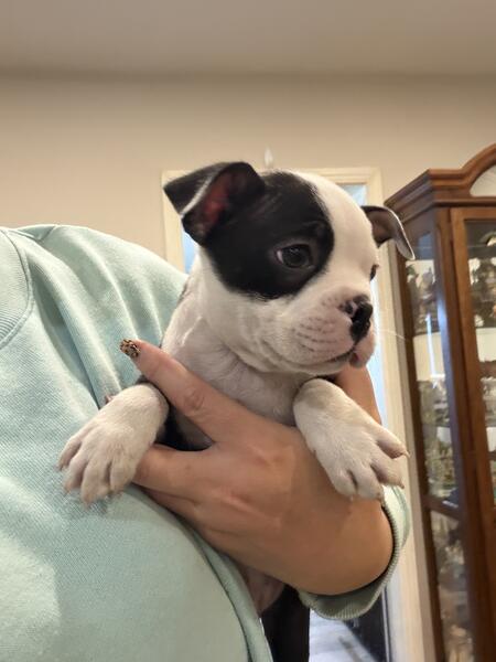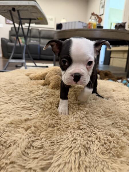 message pogle about this ad Handsome AKC Boston Terrier puppy named Prince. He has a unique marking of half white half black face. He is very cuddly and friendly right now. He was born 9/5/25. He will be ready to go to his new home by 10/31. He will come with registration papers, up to date vaccination record, vet check and limited guarantee. To reserve a puppy, we require us a $200 non-refundable deposit to hold. Delivery can be via pick-up or shipped. We usually can ship for around $300, we just need your zip code |