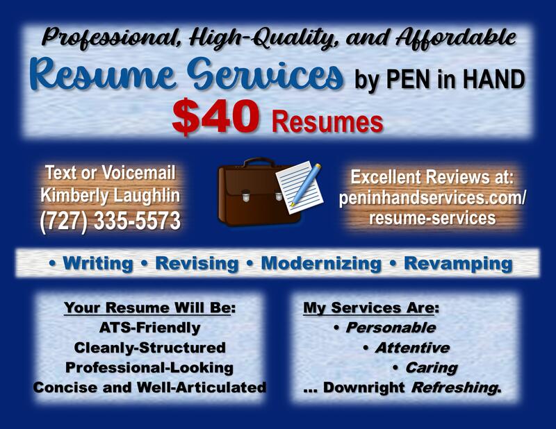 message kimlaughlin7 about this ad Resume Services by PEN in HAND, operating remotely from St. Petersburg, FL, is providing professional, high-quality resume services for only $40 per resume. Specializing in transforming and revamping resumes for ambitious job seekers and other impressive individuals seeking a promotion. Text or voicemail Kimberly Laughlin at (727) 335-5573. What you will get for $40: 1) A thorough editing of the content of your resume. 2) A complete revision of the formatting to make it as clean, organized, and ATS-friendly as possible. 3) Structuring with a focus on the most relevant keywords appearing at the top, mainly in the summary and the skills section, directly under the header. 4) Any and all revisions, corrections, additions, and deletions upon your request after your review of the draft. 5) Any changes, updates, etc. after my completion and your payment are most often free of charge, depending on the extent. Your resume will be: Concise Intelligible Appealing ATS-Friendly Well-Articulated Well-Structured Cleanly Formatted Professional-Looking Error-Free, of course! My resume services are: Professional High-Quality Affordable Kindhearted Personable Attentive Caring Downright Refreshing! Proven Excellence: Job seekers and other impressive individuals seeking a promotion are saving money on resume services, while also getting excellent results and giving me great reviews numerous reviews are posted in the footer of my website. These are my most recent client reviews and comments: Kimberly made my resume look clean, modern, and professional. She really knows her stuff! Wow! Looks amazing! Thanks again. Your work is magical. Kimberly was a pleasure to work with. She is knowledgeable and professional. She met all my needs and has a fast turnaround time. Would highly recommend. Nice to do business with Kimberly at Pen in Hand. She was very open and accommodating during the updating of my rusty resume. A breath of fresh air to deal with a level-headed business and resume extraordinaire. Thank you, Kimberly! Very professional! Great to work with! Does the work fast and concise. Would highly recommend! If you or someone you know could use my services, please message me, Kimberly, or text me at (727) 335-5573. We can then speak on the phone if you wish. I personally prefer phone consultations because, like most people, I like to be able to speak with a person one-on-one, but you will find me genuine, attentive, professional, and personable through any form of contact, which you will also find in my client reviews. If, for some reason, you call instead, PLEASE leave a voicemail so that I can reach back to you. My contact hours are 10 am to 7 pm EST Mon through Sun. message kimlaughlin7 about this ad |