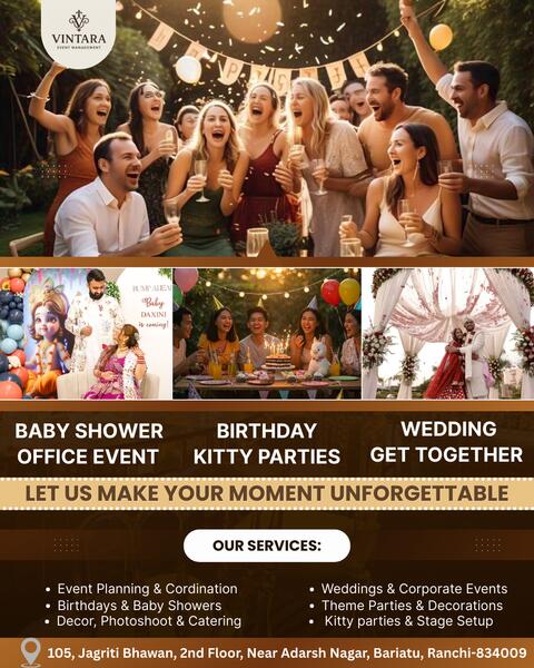 message vintara about this ad Celebrate in Style with Vintara Looking for the perfect event planner in Ranchi? At Vintara, we turn your special occasions into extraordinary experiences. Whether its a dreamy wedding , a lively birthday , a corporate meet , or a cultural show we bring creativity and flawless execution to every event. From elegant dcor and theme setups to entertainment, catering, and complete management, our team handles it all with precision. With Vintara by your side, you just enjoy the celebration while we make everything picture-perfect. Choose Vintarawhere every event becomes unforgettable! Contact us for Enquiry: 9234535764 Ranchi, Jharkhand, India |