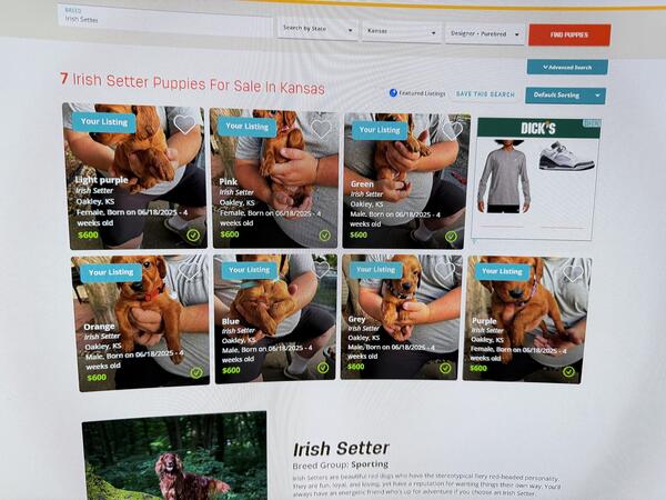 message hartbreeders about this ad Each puppy is a purebred Irish setter from long tested bloodlines. The delivery process is in state contact us for availability. If out of state must purchase kennel and pay for air freight next day. Prices vary. Each puppy comes with pedigree and health vet checks. Dew claws have been removed. Breeding rights must be negotiated before purchase. Puppies are sold without them and must be spayed or neutered as soon as they are of age. contact at 785-953-0312 |