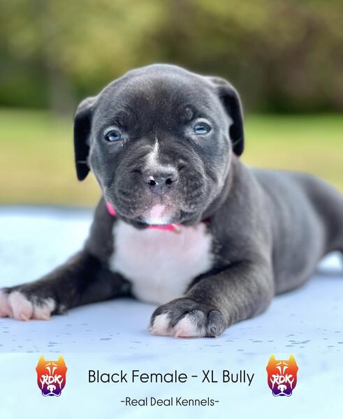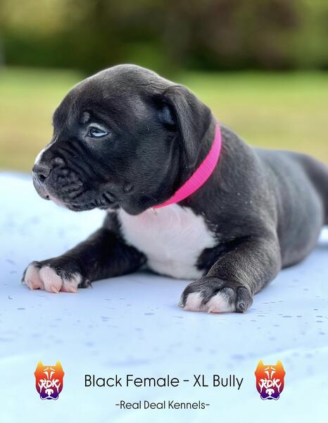 message realdealkennelsllc about this ad Born September 19th, 2025 Female Markings: black with white markings on paws, chest and nose Mom: XL blue tri Merle ABKC Registered Dad: XL black tri ABKC & UKC dual registered IG: @realdealkennels_nc_ / @rdkdogs_nc_ Website: realdealk.com |