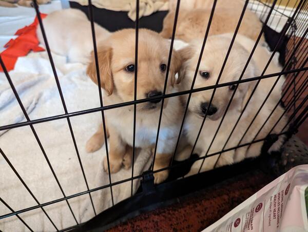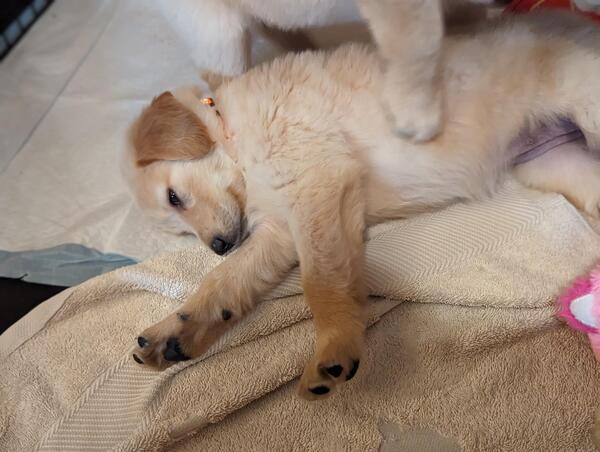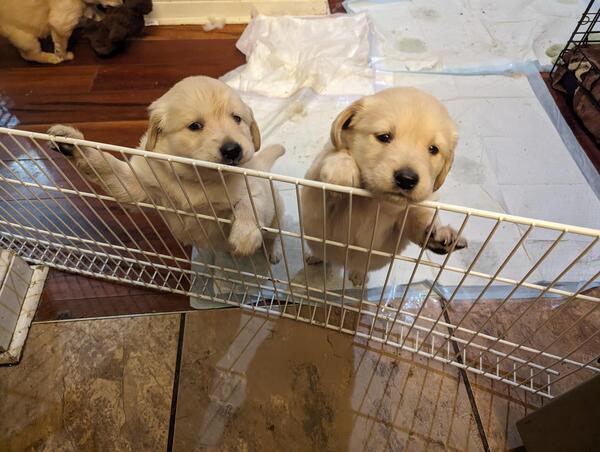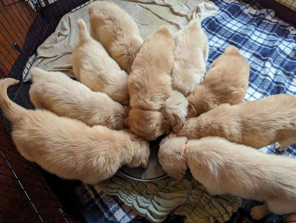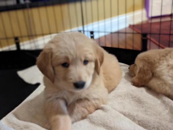 message mrcch892 about this ad RESERVE NOW CKC Certified, AKC Pending. 2 Male, 7 Female. Red Sire (CKC Golden Dam (AKC 2 1/2 years old. Pups ready on 1/26 (8 weeks old Available for pick-up most week days, Saturday, Sundays after church. Pedigree and Health Record Provided. Beautiful, Healthy Puppies RESERVE NOW Simmons Gorgeous Goldens are raised by a big family with lots of love and pampering. These puppies are so smart! They already come on command; some have learned to sit on command, and most consistently use a pee pad when not outdoors. The sire, Rimshot, is a taller, 3 year old, medium-red boy, who loves fetch more than food! He likes to help keep the pups clean or snuggle with them when they have taken naps outdoors. The Dam, Biscuit, has been an incredible first time mother. Nine pups can be overwhelming, but she has been patient, gentle, and attentive. When the litter goes outside to play, she manages to keep an eye on them all. If one or two go too far away , she goes after them, then does a quick scan of the yard, as if counting all the others. Maple, Biscuits sister, has been a fun Auntie. She loves to play with the pups, rolling balls to them with her nose, and doesnt seem to mind that they are lately trying to eat her big-girl dog food! Nine against onethe pups are bound to win! These puppies have had continual socialization opportunities, both with the dogs and with our large family and holiday guests. Pups are are vaxxed, dewormed and will soon be ready to join YOUR FAMILY. They will be eight weeks old and ready for cuddles on January 26, 2024. RESERVE NOW! message mrcch892 about this ad |